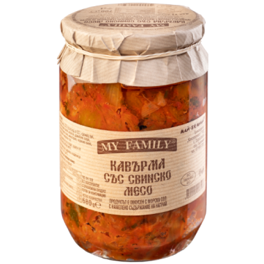 Kavarma with Pork - A classic Bulgarian dish made with 33% pork (EU origin), slow-cooked with red wine, roasted red peppers, carrots, onions, and porcini mushrooms. Enhanced with tomato puree, sunflower oil, sea salt, and a blend of aromatic spices, this hearty meal is rich in flavor and ready to serve. Perfect for family meals or gatherings, it captures the essence of traditional Bulgarian cuisine.