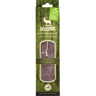 Clean food (without E-additives), without GMOs, gluten and meat substitutes. Prepared from game meat (40%), veal, forest herbs, sugar, salt, rosemary extract, wine. The casing is not edible. Nutritional value for 100g product: Energy value: 1642kJ/ 395kcal; Fat: 22.0g, of which saturated fatty acids: 10.9g; Carbohydrates: 2.1g, of which sugars: 0.8g; Proteins: 30.9g; Salt: 3.4g. Storage conditions: from -1 to 5ᵒС. Food with a high protein content (100g of finished product contains 180g of pure meat)