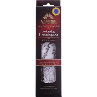 Traditional Bulgarian cured delicacy recognized in the European Community for food with specific traditional character. Prepared in strict compliance with the traditional technology. For the preparation of sausage Panagyurska is used beef and pork with a little fat, which is being grinded and mixed with aromatic spices. The lukanka type salamis are filled in natural or collagen casings, then ripe and dry until ready. During drying, dry sausage loses 40 to 45% of its weight. The finished product has a specific aroma and mild taste of matured meat and spices. Served with a glass of red wine, salami Panagyurska of KFM is a real pleasure for the senses. It is also suitable in the preparation of sandwiches and all types of cold starters - alone or in combination with other types of salamis and cheeses. Natural product that does not contain meat substitutes, GMO and gluten.