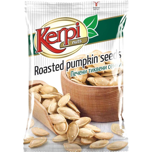 Kerpi's Roasted Pumpkin Seeds, in a convenient box of 17pcs x 100g, offer a nutritious and flavorful snack perfect for any time of day. Expertly roasted to enhance their natural taste and crunch, these pumpkin seeds are a healthful delight packed with essential nutrients and minerals. Made with high-quality, non-GMO seeds, Kerpi provides a guilt-free snacking option that supports your well-being. Ideal for adding a tasty and nutritious crunch to salads, baking, or simply enjoying on their own, these roasted pumpkin seeds are a versatile kitchen staple. Embrace the wholesome goodness of Kerpi's Roasted Pumpkin Seeds, a delicious boost of energy and nutrition straight from the heart of Bulgaria.