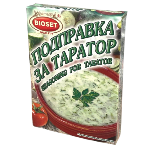 Elevate your tarator, the traditional Bulgarian cold soup, with the flavorful and aromatic Seasoning for Tarator by Bioset. Each box contains 10 packs of 40g seasoning, specially crafted to enhance the refreshing taste of tarator. Made with high-quality herbs and spices, this seasoning mix adds a delightful touch to your homemade tarator, making it even more delicious and authentic. Trust Bioset's seasoning to bring out the best in your culinary creations.